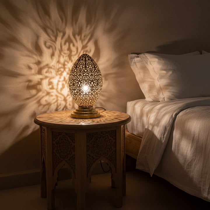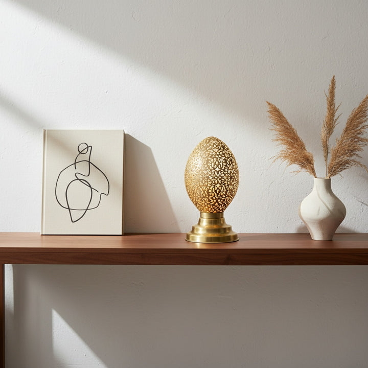 The Aderfi table lamp radiates calm strength and artisan precision. Its sculpted brass silhouette blends ancient craftsmanship with clean modern lines. Perfect for side tables, nightstands, or reading nooks, this handcrafted piece adds soulful warmth to any interior. A refined accent rooted in Moroccan tradition.