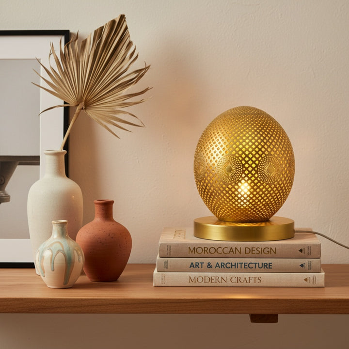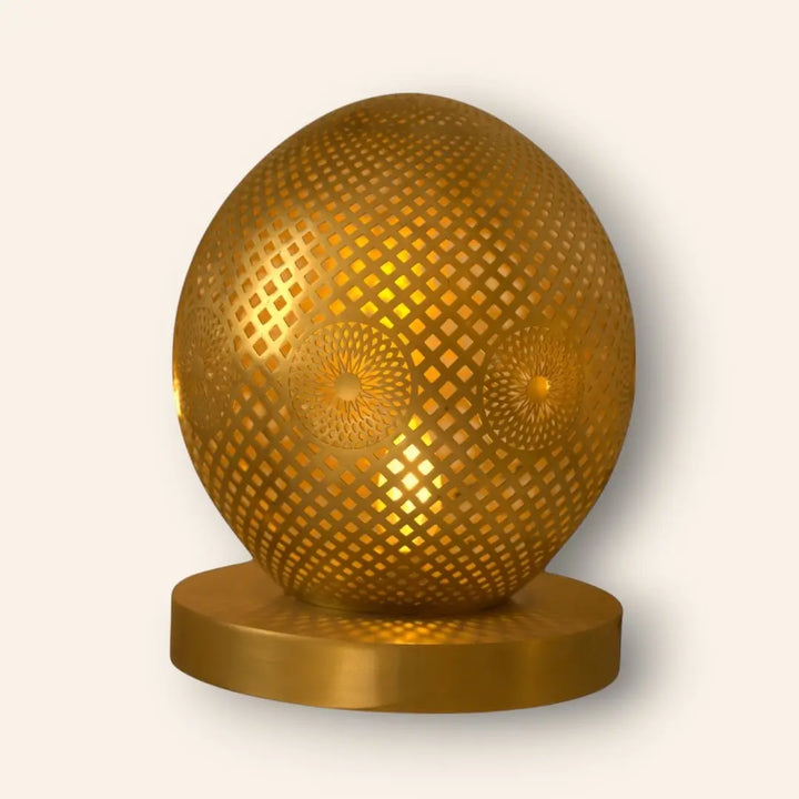 Aghilas is a bold and grounded table lamp, its name echoing strength and resilience. The etched brass body reflects Moroccan mastery in metalwork, blending traditional patterning with sculptural presence. Ideal for statement corners or moody reading spaces, it radiates character and warmth.