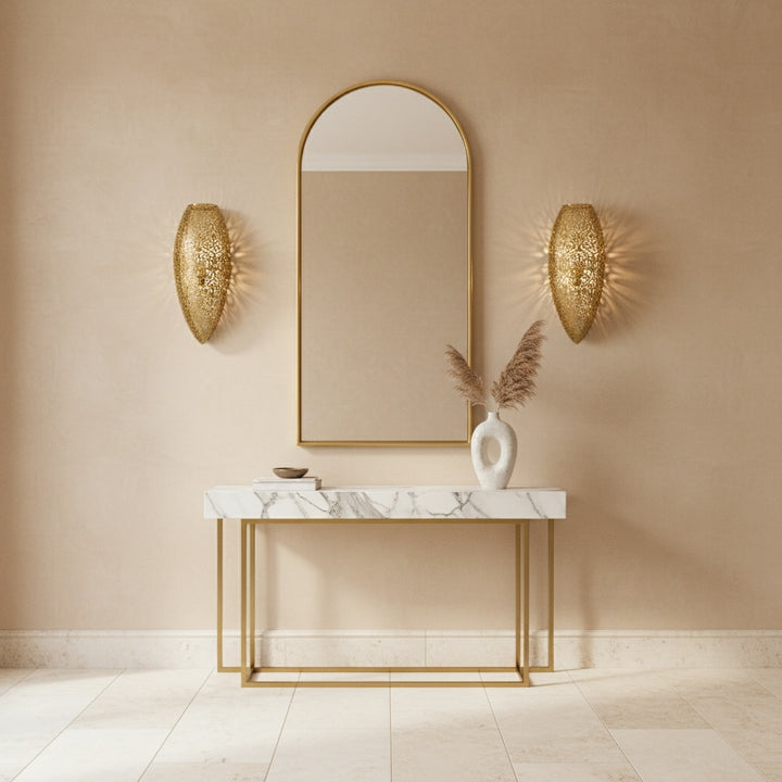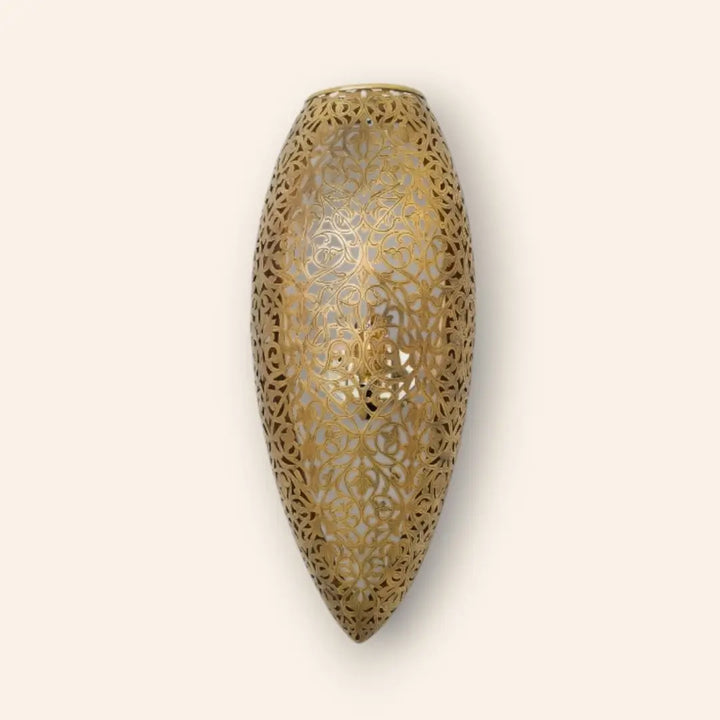 Aman means “water” in Tamazight — fluid, essential, and life-giving. This sconce channels that flow with smooth brass curves and delicate, wave-like perforations. Light pools gently against the wall, echoing the rhythm of springs hidden deep in the Atlas.