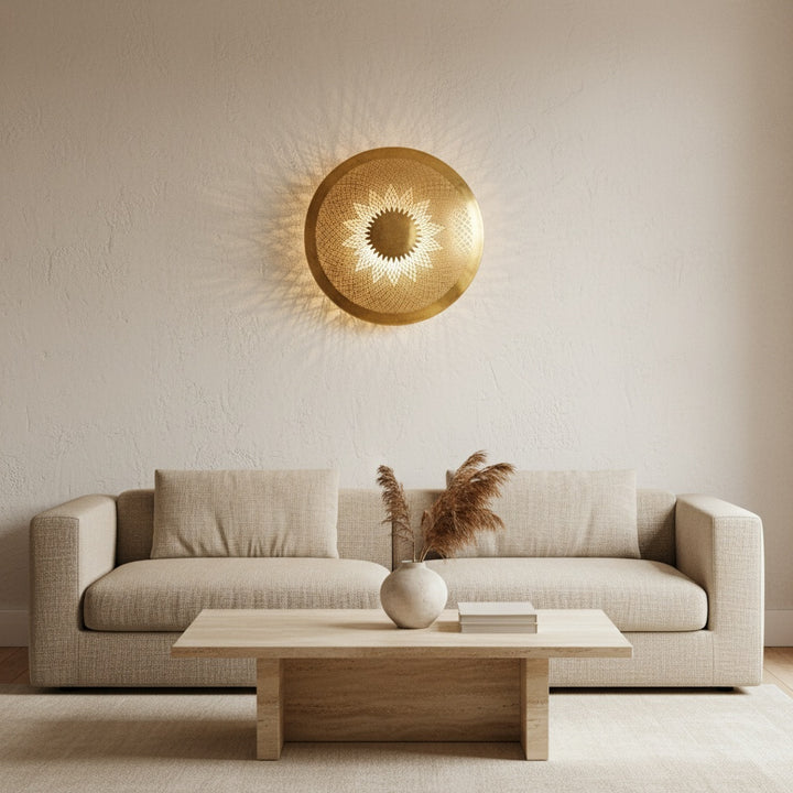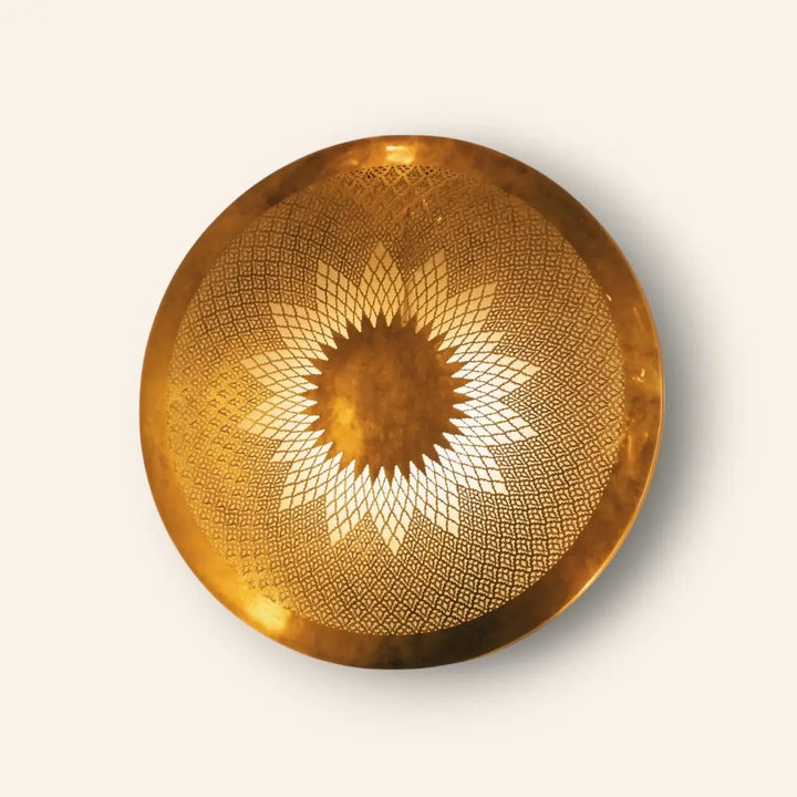 Ayla translates to ‘halo’—and true to its name, this handcrafted wall sconce emits a soft, celestial glow. Its round shape and brass latticework project delicate light patterns, ideal for serene hallways or reading alcoves. Perfect for adding character and artisanal warmth to contemporary interiors.