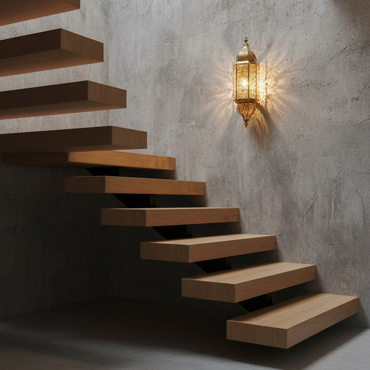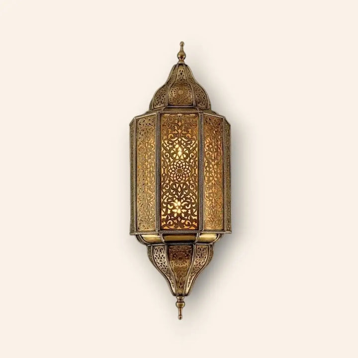 Ghalia glows like a whisper of gold. Crafted in polished brass with subtle dimpling, it emits a soft, radiant aura. Ideal for intimate lighting in bedrooms or entryways, it infuses refinement into any setting.