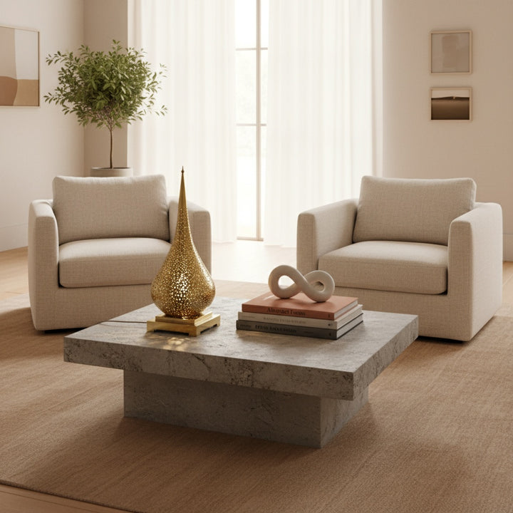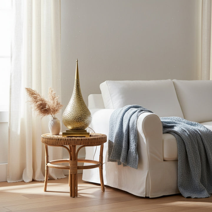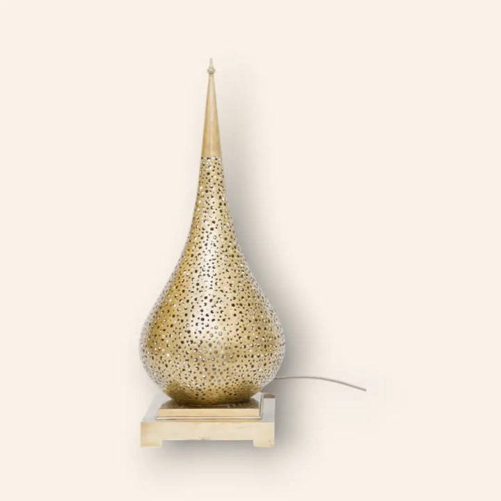 Izuran reflects the imprint of time—its name means 'roots' in Amazigh. This table lamp is rooted in ancestral technique, with a tactile surface that scatters light poetically. A luminous sculpture for desks, nightstands, or sideboards, handcrafted in warm brass.