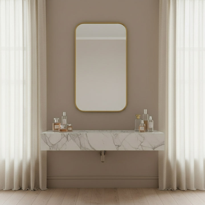 Lalla carries the poise of Moroccan nobility in modern form. Its softened rectangles create quiet balance—gold-framed layers that feel both architectural and feminine. With every reflection, Lalla honors the woman who holds space, who anchors beauty without needing to speak it aloud.