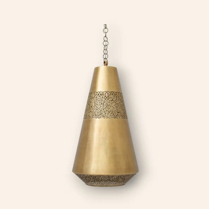 Malak exudes regal simplicity through its minimal yet refined form. Handmade by Moroccan artisans, its luminous brass surface glows with warmth and character. Ideal for interiors that blend tradition and modernity, this pendant is a jewel suspended in light.