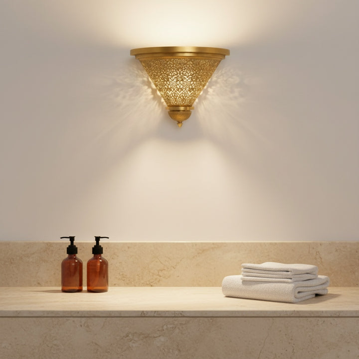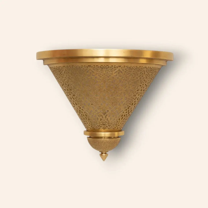 Nayla means “the one who succeeds” — a name that carries grace and strength. This sconce is slender, elegant, and subtly curved, with hand-perforated brass glowing from within. It feels like a quiet celebration of effort, endurance, and reward.: