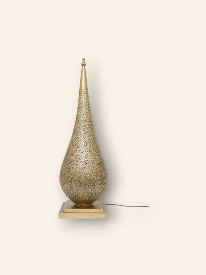 Noura is a constellation in lamp form. Its domed design and finely pierced brass diffuse soft light in all directions. A serene floor piece for bedrooms, meditation areas, or luxurious hotel suites seeking a poetic glow.