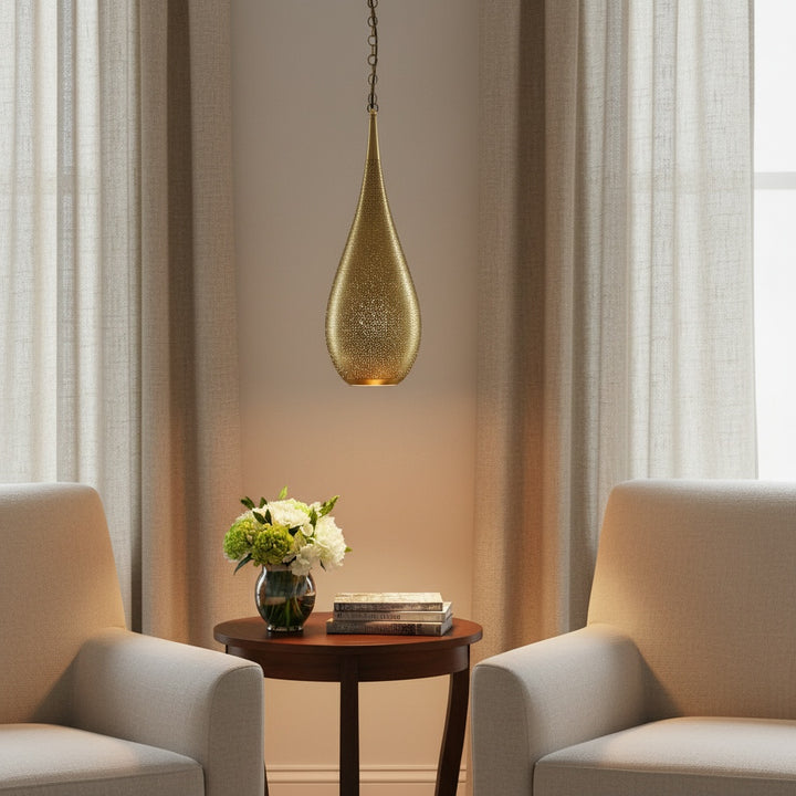 Souira—Arabic for “little image”—is a slender, hand-perforated brass pendant light whose teardrop lampshade casts a mosaic of light and shadow like miniature tapestries. Perfect as pendant lights or ceiling lights, it harmonizes with wall sconces and chandeliers, and elevates table lamps, floor lamps, outdoor lighting, lampshades, and home accessories with authentic Moroccan craftsmanship.