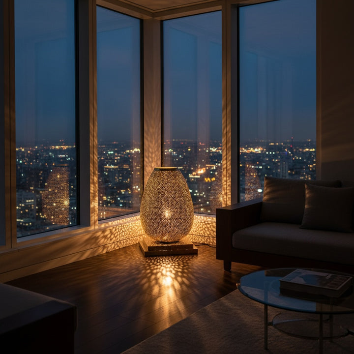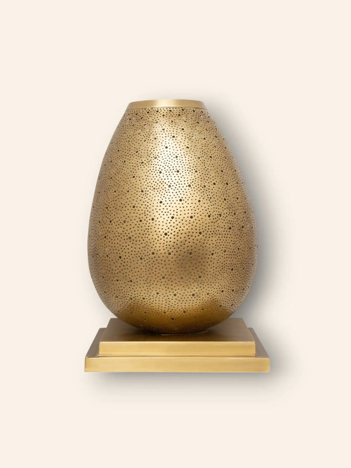 Talea rises like a sentinel. Tall and composed, it brings the strength of Moroccan metalwork into a modern silhouette. Forged from hand-shaped brass and grounded in a circular base, it casts protective and poised light.