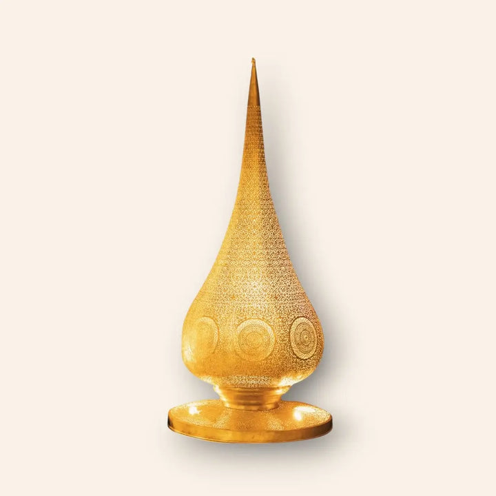 Tazarine evokes the desert village where brass glows under open skies. This lamp’s structure is tall and slightly tapered, recalling the outline of desert towers. Its light filters through hand-pierced metal like wind threading through palm fronds.