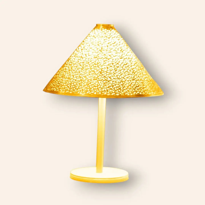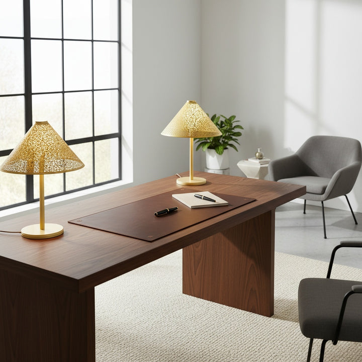 Tazult captures the spirit of balance and rhythm. Its flowing form and cutwork brass shell create dancing shadows across walls and surfaces. This elegant table lamp is perfect for adding sculptural interest and atmospheric glow to interiors rooted in both tradition and modernity.
